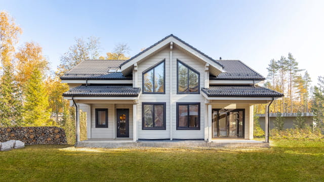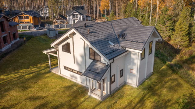Или другой проект - двухэтажный дом по проекту «Ривертон», сочетающий в себе характерные для стиля шале черты – лаконичные архитектурные формы, минимализм во внешней отделке и покатый тип крыши. Отсутствие высокого фундамента, просторная терраса и балконы второго этажа сближают пространство дома с окружающим ландшафтом. Длинный свес кровли под черепицей БРААС ТАУНУС ГРАФИТ надежно защищает террасу от осадков и прямых солнечных лучей. Дом оформлен в контрастных оттенках серого, которые отлично гармонируют с цветом брусчатки и темно‑зеленым газоном, придавая выразительный облик всему участку. Несмотря на лаконичность в оформлении и отсутствие лишних деталей, дом выглядит очень нарядным: особой привлекательности ему добавляют решетчатые ограждения террасы и балконов, асимметричная форма крыши и яркая цветовая гамма.